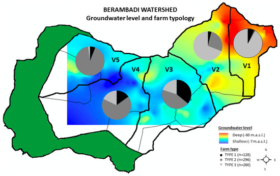 The spatialization of the typology was based on the village which is recognized as an important criterion for spatialization to consider for instance the social structure (see panchayat). Other criteria may be interesting for spatialization such as the distances to main roads, the soil properties and the groundwater level at the farm location to discuss the access to markets and crop outlets as well as constraints to crop choices and farming practices. Farm-type locations in the watershed follow an east-west gradient, with more irrigated farms in the east and more rainfed farms in the west (Figure 7). This farm-type distribution is linked to the trend in investing in irrigation since the 1990s which caused the unusual inverse gradient of the groundwater table [13,14].