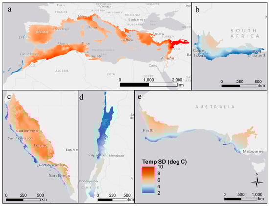 Seasonal variation in mean monthly temperatures (SD) for the five Mediterranean regions of the world: Mediterranean Basin (a); South Africa (b); California (c); Chile (d); and Australia (e). Data source: Worldclim Database, v1.4 [29]. Records correspond to the period 1960–1990.
