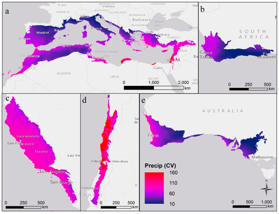 Seasonal variation in mean monthly precipitation (CV) for the five Mediterranean regions of the world: Mediterranean Basin (a); South Africa (b); California (c); Chile (d); and Australia (e). Data source: Worldclim Database, v1.4 [29]. Records correspond to the period 1960–1990.