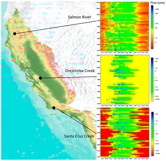 The strong spatial and temporal variation in climatic and topographic characteristics within and among Mediterranean-climate regions has direct influences on the pattern and distribution of flow regimes. In California, for example, 2/3 of annual runoff is conveyed by streams in the northern 1/3 of the state [27]. Stream flow regimes are also highly influenced by topography, including orographic effects and the proportion of precipitation falling as snow, which gives rise to spatial variation within regions. For example, the Salmon River (drainage area: 1950 km2) in northern California has mean annual runoff of 815 mm and has a mixed rainfall-snow runoff regime, with peak flows (>500 cubic meters per second (cms)) in the early winter and high flows (>100 cms) extending through the early summer, followed by steady summer baseflows into the fall (5–10 cms) (Figure 3). In contrast, Orestimba Creek (drainage area: 350 km2), located in a rain shadow on eastern side of the California’s coast range has an annual runoff of only 40 mm. It flows intermittently from December through May with rainfall runoff and is predictably dry the rest of the year. Santa Cruz Creek (drainage area: 200 km2) is located on the coast of southern California. It conveys 90 mm of runoff per year, with flow patterns driven by rainstorms concentrated in the wet season. All three streams show strong seasonality and notable inter-annual variability in both the timing of peak flows and duration of the low-flow period (Figure 3).