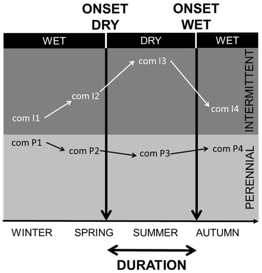 The onset and the duration of the dry and wet periods can also influence seasonal variability in biological communities (Figure 4). The onset of the dry season is a critical time that can result in dramatic consequences for communities in Mediterranean-climate streams and rivers. Many macroinvertebrates in these systems have their life cycles synchronized with the onset of the dry period (e.g., [41]). Therefore, an early or a later drying period can lead to significant community changes.