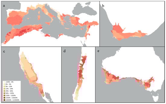 Projected changes (%) in extinction rate of freshwater fish populations between future and current climatic conditions in Mediterranean-climate regions in the world: Mediterranean Basin (a); South Africa (b); California (c); Chile (d); and Australia (e). Modified from the Global Freshwater Biodiversity Atlas [148].