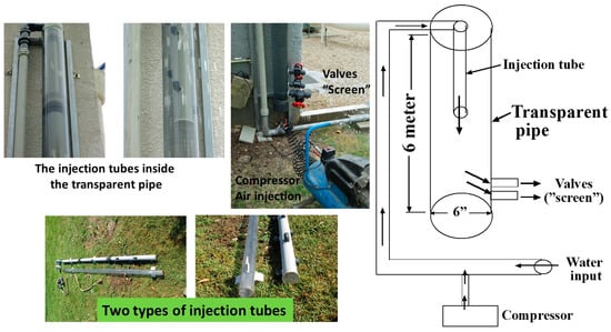 The injection discharge was 6–10 m3/hour at a pressure of 4 atmospheres, which was the pressure in the regional water system. The temperature was constant. The air was injected artificially into the system by a compressor (Figure 2).