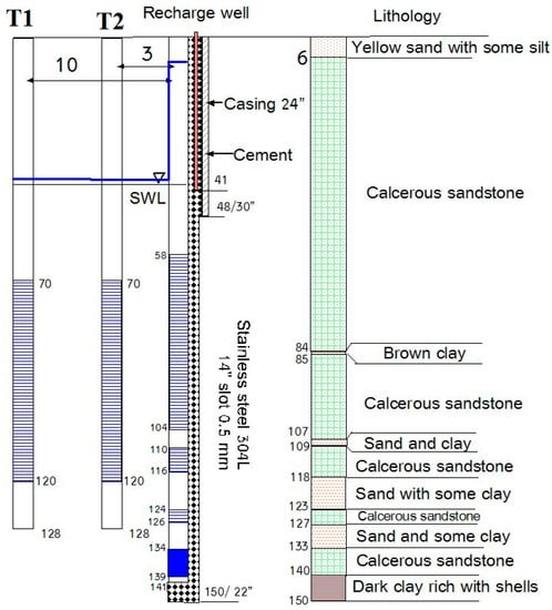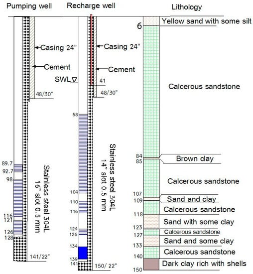 The production well was equipped with a 16″ casing and screen. The length of the screen section in the production well is shorter than in the recharge well because it takes into consideration the dynamic drawdown and the depth of the pump. Figure 3 shows the technical profile of the production (pumping) and the recharge wells in the pilot site.