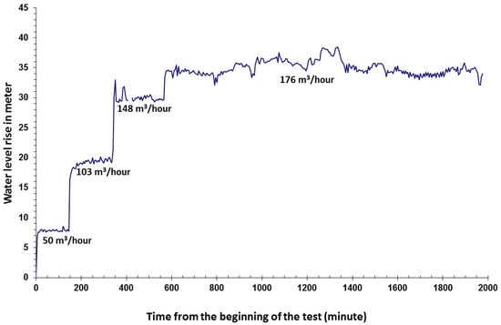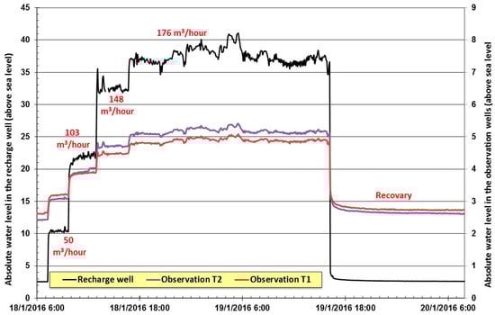 During the injection period, the water levels in the recharge well and in the two nearby observation wells were measured continuously. The distance of the observation wells from the recharge well was 3 m and 10 m, respectively. With an injection rate of about 176 m3/hour, the water level inside the recharge well was raised by around 34 m, while in the observation wells it was raised by 2.67 m to 1.73 m, respectively. Figure 8 shows the course of the water level in the recharge and observation wells during the recharge test.