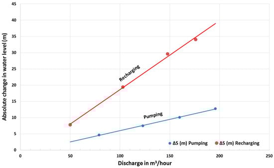 When comparing the aquifer and the well loss coefficients of the two tests in the recharge well (Table 2), we can see that the aquifer loss coefficient (B) in the recharge test is 2.68 times greater than during the pumping test, and the well loss coefficient (C) is about 6.09 times greater than during the pumping test.