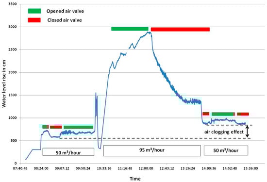Opening the valve during the injection created vacuum conditions (Venturi effect) and a mixture of water and air entered the well, as can be seen in Figure 7. Increasing the hourly discharge from 50 m3/hour to 95 m3/hour together with the opened air valve raised the water level immediately by approximately 22 m in 90 min. During injection at 103 m3/hour the water level rose by around 19 m (Figure 5). This means that the presence of air in the injected water added about 3 m. Similar results were received when comparing the measurements at the same discharge (50 m3/hour) with the closed valve (Figure 7). In this experiment, the air clogging added about 2.6 m to the 6 m rising at 50 m3/hour.