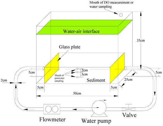 The experimental apparatus is illustrated in Figure 1. The tank, made of clear poly(methyl-methacrylate) organic glass, was 50 cm long, 25 cm wide, and 35 cm high. It was wrapped in aluminum foil to deter algae growth and reproduction under light stimulation. The tank cover was equipped with a small hole to provide access for the DO meter probe and for water sampling; this was sealed with a rubber plug when not in use. Two vertical 10-cm-high glass plates were placed inside the tank, 5 cm away from the water inlet and outlet pipes, as shown in Figure 1. The sediments were placed between these two plates to protect the sediment surface from being washed away by the water flow. Three small 6-mm-diameter holes were drilled along one side of the tank, with the first being about 1 cm above the sediment surface and the others 3 cm and 6 cm, respectively, below the sediment surface, and rhizosphere soil solution collectors (Rhizon pipes) inserted horizontally into each to collect porewater samples. The structure of the Rhizon pipes is illustrated in Figure 2. The sample sediments for the laboratory experiments were taken from an aquaculture pond, containing three species of fish, namely black, grass, and silver carp, with a breeding density of about 6000 kg·ha−1. These sediments consisted of muddy fine sandy soils with a mean particle size of about 0.1 mm. Distilled water was used as the overlying water to eliminate any effects of algae and microorganism in natural water. In order to conduct synchronous measurements under different flow rates, five identical sets of the apparatus shown in Figure 1 and Figure 2 were constructed, each with its own pump, to allow the circulation flow rates to be adjusted independently. Seen from Figure 1, the pipes, the valve, water pump, flow meter, and tank were composed of a water flow process. Along with the arrow direction, water in the tank flowed circularly, with the water pump adjusting the water flow rate.