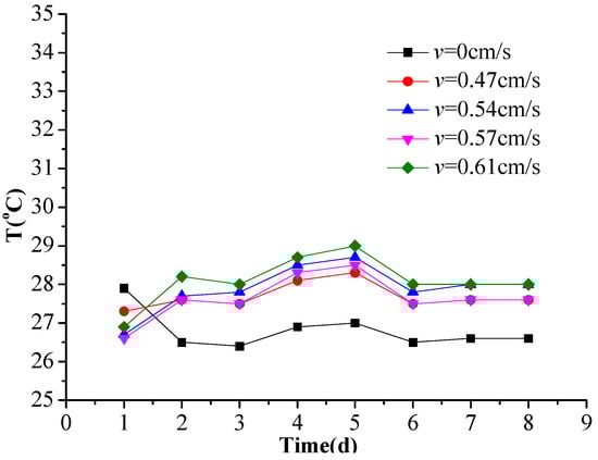 Water circulation driven by pumps inevitably emits some heat, slightly raising the water temperature. In our experiments, water temperature was measured daily and the results are shown in Figure 3. The water temperature in the still-water tank (i.e., with no pumping) was lower, as it was only influenced by air temperature, but the water temperatures in the other four tanks (v = 0.47, 0.54, 0.57, and 0.61 cm·s–1) were very similar. Water temperature is known to indirectly influence P release in sediments [26], with a high temperature boosting the activity of some substances and accelerating physical, chemical, and biological reactions such as the diffusion and degradation of organic matter. Microorganisms can also decompose organic P in sediments into inorganic P and convert insoluble phosphorus compounds into soluble ones and higher metabolic rates can accelerate the degradation of organic matter [27], thus promoting P release from sediments. For N release, Liu et al. [28] reported that water temperature can influence degradation speed, when temperatures drop too low, the degradation of N in deeper-sediments can cease altogether. Based on a series of experiments on sediment contaminant release, Huang et al. [29] found that a high temperature accelerates the emission of dissolved contaminants considerably. Ogilivie et al. [30] agreed, pointing out that rising temperatures not only favor ammonification and nitrification but also enhance ammonifying and nitrifying bacterial activity.