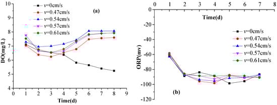 The DO levels in the overlying water and the corresponding ORP values are presented in Figure 4a,b, respectively. ORP is a measure of the relative degree of water oxidizability or reducibility. Wetzel et al. [31] and Seiki et al. [32] showed that the DO content in the overlying water is an important factor influencing ORP. As the data in Figure 4a shows, even when the culture tanks were sealed and not aerated, the existence of an air-filled space above the overlying water provided some air re-aeration through water surface entrainment caused by the circulating water flow, as indicated by the declining concentrations of DO over the first two days and the subsequent increases later in the experiment, which contrast markedly with the DO concentrations in the still-water tank, which declined monotonically throughout. Interestingly, the data in Figure 4b show that the ORP was consistently negative, ranging from −60 to −100, implying that the culture water environment favors the reduction of ORP.