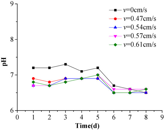 For all the flow rates tested, the culture water pH was effectively independent of flow rate varying only from 6.5 to 7.0 (Figure 5), indicating a weak acidity, although pH did tend to decrease with culture time. The pH is known to have a significant impact on P morphology [33], however, as iron, aluminum, and cadmium in water and sediments are highly likely to react with soluble inorganic P in acidic solutions, forming non-dissolvable deposits, while anions of phosphate are more likely to be absorbed by bauxite, kaolinite, and/or montmorillonite, as well as by newly precipitated Fe(OH)3 and aluminum hydroxide (Al(OH)3) colloids. The deposition-dissolution and adsorption–dissolution processes have a major influence on the physiochemical dynamics (in this case, the solubility and biological cycle) of P compounds. pH also plays an important role in N release from sediments, with the optimum pH for sediment nitration being about 7.5 [34]. If the pH of the water increases, the rate of nitrification rises, leading to higher levels of free ammonia nitrogen. However, when the pH exceeds 7.5, the nitrification rate becomes almost independent of the free ammonia nitrogen concentration. During this experiment, the pH in the overlying water was kept weakly acid, with a pH below the optimum value, thus limiting the activity of the enzymes in the nitrifying bacteria and reducing the nitrification activity.