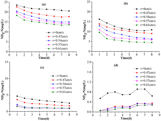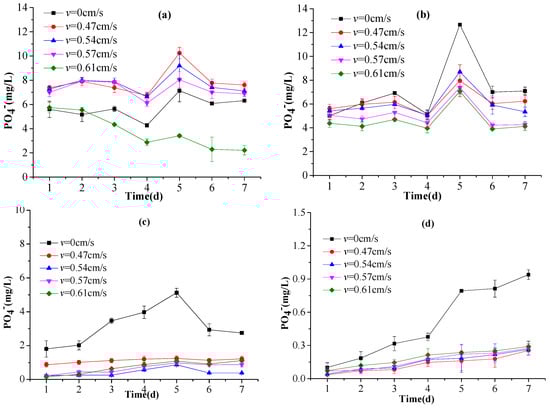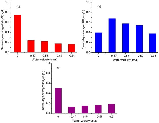 The levels of NH3-N, NO3-N, and PO4− are generally used to indicate water quality in aquaculture ponds. Figure 10 shows the seven day average values of these three variables in the overlying water measured in this study under different water velocity conditions. As Figure 10a shows, the NH3-N concentrations in the overlying water decreased with increasing water velocity. When the overlying water was still, the NH3-N concentration was more than 3-fold higher than was the case when the water was moving at any of the flow rates tested, and the NH3-N concentrations decreased with increasing water velocity, although this trend slowed as the water velocity increased. Figure 10c shows that this was also true for PO4−: when the overlying water was still, the concentration was once again almost 3-fold higher than when the overlying water was moving, but unlike NH3-N, when the water was flowing the PO4− concentrations increased with increasing water velocity. Similar results were reported for earlier studies by Luo et al. [38], Duan et al. [39], Larned and Atkinson [40], and Zhu et al. [41]. For example, Larned and Atkinson found that with increasing water velocity, the rate of NH3-N and PO4− uptake were positively correlated with velocity by D. cavernosa, which indicates that the NH3-N and PO4− concentrations when the overlying water maintains a certain velocity are lower than those found in still overlying water. Zhu et al. found that sediment resuspension does not always increase phosphorus concentration in overlying water in shallow lakes, which means there is an effect threshold of water velocity on the lowest or highest concentrations of phosphorus. In this study, we conducted experimental measurements for a relatively coarse scale of five water velocities in the overlying water. A more detailed examination of what happens when the water velocities are within the narrow range of 0 to 0.47 cm/s, where the data shown in Figure 10 indicate major changes appear to occur, could provide useful experimental data that better explains the observed trends in nutrient concentrations.