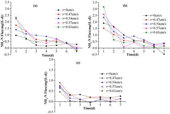 The release flux of NH3-N during the course of the experiment measured at depths of: (a) 6 cm; (b) 3 cm; and (c) 1 cm within the sediments.