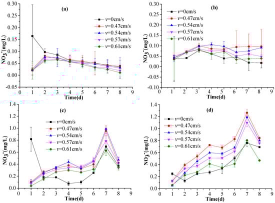 One possible explanation for this observation is that because the sediment was disturbed by the water flow, more NO3-N and NO2-N was released from the sediments into the overlying water and NO2-N was more likely to be oxidized into NO3-N. This is also probably true for the 1-cm-deep sediments, which were soaked by the overlying water. As time progressed, the NO3-N concentration in the overlying water and in the 1-cm-deep sediments increased, reducing the concentration gradient between the sediments and the overlying water. Comparing the DO variations (Figure 4a) with the NO3-N variations (Figure 8), a lower DO generally corresponded to a higher NO3-N concentration regardless of the flow rate or sediment depth, indicating that some NO2-N had probably been gradually oxidized into NO3-N due to aeration from the overlying water. This transformation process is supported by the variations in the NH3-N concentration (Figure 6). The NO3-N concentrations in the 3-cm- and 6-cm-deep sediments exhibited flipped “V-shaped” variation trends for the test flow rates, possibly as a result of the dynamic exchange of NO3-N between the upper and lower sediment levels. At the beginning of the experiment, the deep sediments released NO3-N, leading to a decreased concentration and an increasing release rate.