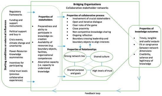 Ongoing reflection on effectiveness of knowledge creation process and its outcomes is another key condition and may be achieved through the facilitation of lessons learnt meetings and reflective workshops []. It is also important to develop a deeper understanding of how certain impacts and outcomes are affected by existing political, cultural and institutional factors [,]. Transformational leadership that elevates stakeholder interests, stimulates a culture with a shared vision, and encourages collaboration and learning are conditions in support of ongoing reflection []. This in turn requires emergent leaders and effective knowledge liaisons and brokers (i.e., agents of change) that are able to build critical connections for knowledge exchange and development between stakeholders in a region [,]. In this context, it is important to understand power asymmetries that may exist between stakeholder groups or individuals occupying different network positions []. Ansell and Gash [] emphasize that power asymmetries not only need to be understood but adequately addressed through the collaborative process.