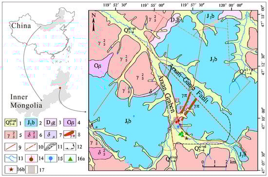 Paleozoic, Mesozoic and Cenozoic rocks are exposed in the study area (Figure 1), and the basement rocks are magmatic rocks. Two broad stages of geological activity (i.e., the Late Ordovician–Mid-Devonian and the Mid-Jurassic–Early Cretaceous) had a significant effect on the regional strata and geological structure []. Magma was found to intrude up until the Mid-Jurassic period. The body of igneous rock is elongated towards the northeast, and is 1.5 km wide and 1.7 km deep []. Granite is the most widely outcropping type of bedrock, accounting for more than 20% of the bedrock in Arxan.