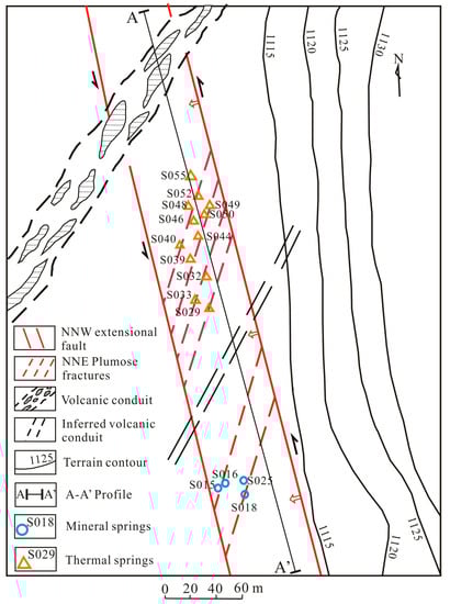 The study area is located in the tectonic unit of the Mongolian arcuate structure and the Neocathaysian uplift zone. The main deep active faults that control the geological tectonics are the Arxan–Gaole conjugate NNE (North-North-East)- and NNW (North-North-West)-trending faults. The deep-seated fault formed by a series of tectonic activities and from continuous stratigraphic deposition. The tectonic evolution in Arxan exhibits a latitudinal sequence, i.e., from an NW (North-West) system to a new Cathaysian system. Generally, the Arxan thermal springs are controlled by the NNW extensional fracture (F1) and NNE compressive fracture (F2), which are located in the central part of the caldera. The NNE fault is a volcanic conduit filled with acidic lava and can be considered as an impermeable wall. The faults extend for 10 km, with an inclination ranging from 70° to 80° [].