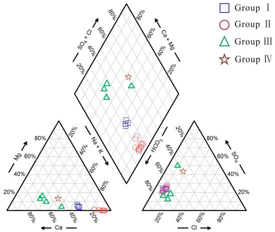 The main anion in all of the water samples was HCO3−, and high Cl− and SO42− contents were observed in the Group II and Group IV samples. The main cations were Na+ and Ca2+, and additional Mg2+ was detected in the Group I and Group III samples (Table 1). According to Figure 3, Group I mainly consisted of HCO3–Ca·Na water, whereas Group II mainly consisted of HCO3–Na water. The shallow groundwater samples (Group III) had chemical characteristics that were similar to those of Group I, i.e., Group III samples mainly consisted of HCO3–Ca·Na and HCO3·SO4–Ca·Na water according to the Piper diagram (Figure 3).