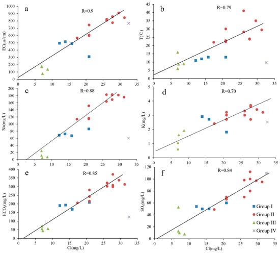 Chloride displays conservative behavior and can be used as a tracer in geothermal systems []. Some major ions and ionic ratios plotted against the Cl content are shown in Figure 4. Strong positive correlations are observed in the EC vs. Cl (R-value of 0.9) and T vs. Cl (R-value of 0.79) plots (Figure 4a,b), implying the mixing of thermal and mineral water. Also, good correlations exist between Na and Cl (R = 0.88) and between K and Cl (R = 0.7) (Figure 4c,d), suggesting the progressive reaction of water with feldspar in the geothermal system, and the ion contents are considered as independent indicators of the residence time []. Thus, the residence time of the samples increased from Group III to Group I, Group II and Group IV. The strong correlations of HCO3 vs. Cl (R = 0.85) and SO4 vs. Cl (R = 0.84) indicate that the thermal water was diluted by shallow cold water (Figure 4e,f) [].