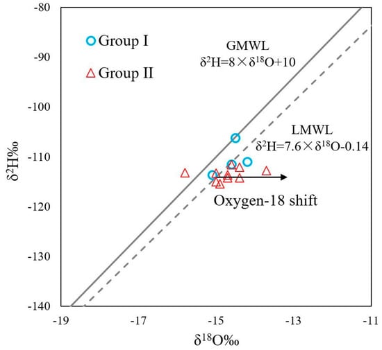 The relationship between the δ18O and δ2H of the springs is shown in Figure 5 with the Global Meteoric Water Line (GMWL) [] and Local Meteoric Water Line (LMWL) []. As shown in Figure 5, all the water samples fall near the GMWL and the LMWL, implying that the spring water is of meteoric origin. A significant 18O shift occurred in the thermal springs in the study area, indicating partial isotopic equilibrium under a high reservoir temperature. The 18O value of the thermal springs is higher, which results from dissolution from the surrounding rocks [,].
