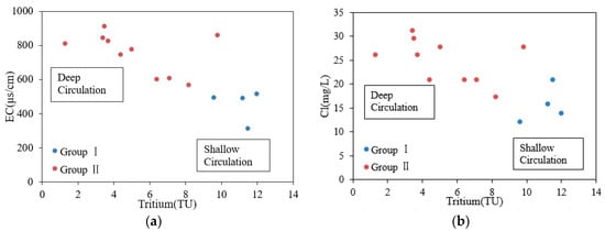 The EC–tritium graph (Figure 6a) shows the existence of water from different origins. Group I shows high tritium and low EC values, indicating shallow circulating water, whereas Group II has relatively low tritium and high EC values and is considered deep circulating water.