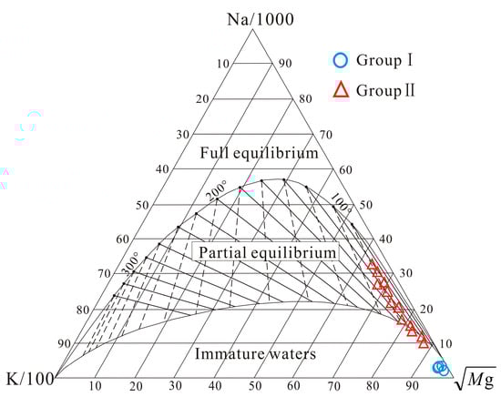 Consequently, the shallow circulation of groundwater probably results in a short residence time, whereas long residence times may be related to deep groundwater circulation []. Thus, we can infer that the Group I samples occur in the shallow cold aquifer related to the local groundwater system, whereas the thermal springs of Group II rising from the deep groundwater system are recharged by deeply circulating meteoric water and are heated by the geothermal reservoir. Meanwhile, the reservoir temperature of the thermal springs is higher than the discharge temperature, and the reservoir temperatures of the thermal springs can be estimated using geothermometers.