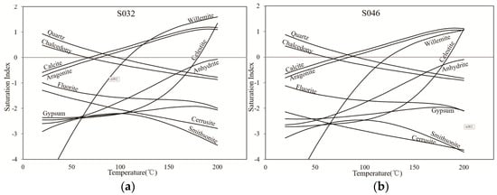 Mineral equilibrium diagram of the sampling points (a) S032 and (b) S046 as representatives of thermal water.
