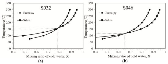 This equation can be solved by using the graphical method, in which S032 and S046 are employed as the representative samples. In Figure 9, X1 is the curve labelled enthalpy, and X2 is the curve labelled silica. The point of intersection of the two curves provides the fraction of cold water and the estimated temperature of the deep thermal water component. The results showed that the proportions of cold water for S032 and S046 were 0.78 and 0.65, respectively.
