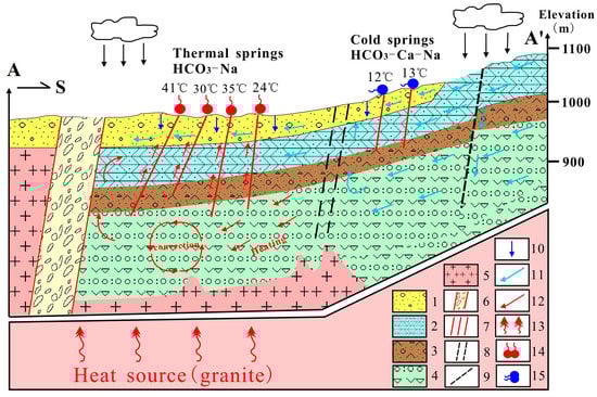 A conceptual model for the circulation of meteoric water along deep fractures based on the hydrogeological features of the Arxan geothermal system is shown in Figure 10.