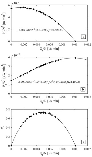 Experimental tests can provide the performance curves of a pump or a PAT at a certain rotational speed value or, alternatively, CFD techniques can be employed. Such curves express the relations of head (H), mechanical power (P) and efficiency (η) with the discharge (Q), and can be expressed as follows: