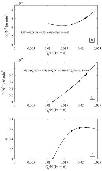 Experimental normalized head (a), power (b) and efficiency (c) of NC80 PAT and regression curves.