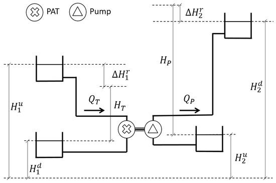 Figure 4 shows a simplified scheme of a P&P plant. The whole water supply system can be considered as two separated network districts which are connected by the P&P plant. The residual head at the end of district 1 that can be turbined within the PAT is represented by the difference , where is the head measured at the end point of district 1, is the head loss in the pipeline approaching the PAT and is the head downstream of the PAT. The lengths of the pipelines are not representative of the real system and, if the values of and are measured near the P&P system, the head losses and can be neglected. As a general case, the two values and are considered different, but the outlet tank of the PAT and the inlet tank of the pump are often the same. The presence of four tanks, however, could even be unnecessary if the P&P system is inserted in a fully pressurized network, and the values of the four variables, , , and depend on time according to the network behaviour. is the flow rate available at the PAT inlet. The power produced by the PAT is , being the PAT efficiency. Such power is transmitted to the pump by the shaft which connects the two machines. is the pumped flow rate while the total head required at the pump outlet is , where the meaning of the symbols is evident. The efficiency of the plant can be calculated as the ratio between the output hydraulic power at pump side and the input hydraulic power at PAT side. Thus, the plant efficiency η can be calculated as: