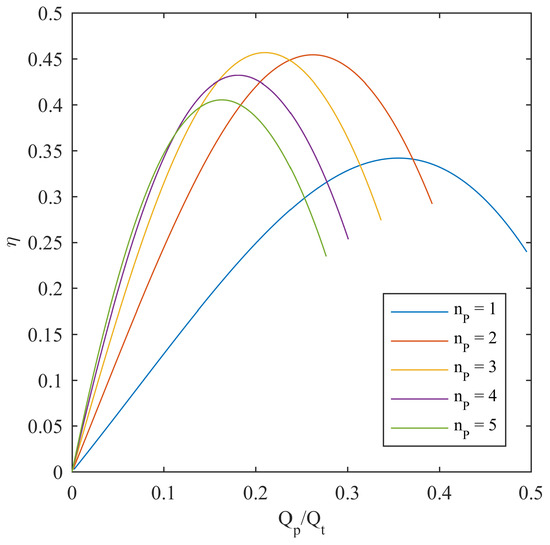 Equation (6) expresses the relationship between the four quantities , , and . A single curve relating and can be obtained if the number of stages of the pump and PAT are assigned. Because and , Equation (6) shows that the relationship between the ratio of the delivered discharge and the ratio of the delivered head is independent of the rotational speed. In Figure 5, the values of are plotted versus for the 1 to 5 pump stages with . In Figure 6, the plant efficiency η is plotted versus . The P&P working conditions are different depending on the number of pump stages. In the presence of a single stage, the pump head is slightly greater than the available head drop at the PAT and the flow rate ratio ranges between 0 and . With two pump stages, the pump head significantly increases (about times the head drop in the flow range 0–0.15) and also the range of flow rate ratio is larger (up to ). With an increasing number of pump stages, the range of flow rate ratio decreases (up to with five stages), while the head ratio increases (up to with five stages). The efficiency of the P&P system also depends on the number of stages. The lowest efficiency occurs for a single stage pump, when the P&P efficiency reaches its maximum value out of the range of the flow rate ratio. The efficiency significantly increases (from less than up to more than ) for a higher number of pump stages. Considering a P&P efficiency larger than , the range of working conditions that can be obtained with the selected pump is quite variable: up to of the water coming from district 1 can be pumped into district 2 with a increase in the pressure head, using a double stage pump, or, at the opposite extreme, with a four stage pump, of the water coming from district 1 can be pumped into district 2 with a pressure head being three times larger than the residual head of district 1. The best efficiency occurs for a three stage pump where of the incoming discharge can be pumped with a increase in head.