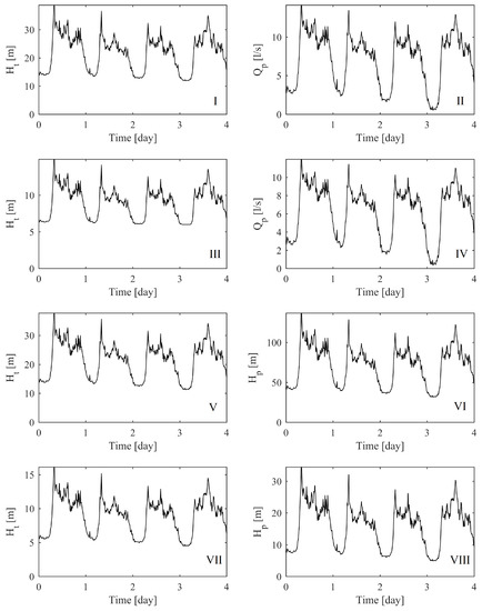 In Figure 8, the turbined head is shown for the four scenarios, as well as the pumped head for scenarios and and the pumped flow rate for scenarios and . The results show the performance of the P&P system in the assigned conditions specified in Table 4. Figure 8I,III,V,VII shows the values of the turbined head depending on time. The calculated values of should be less than the available residual pressure while an additional valve could be placed to dissipate the excess head, if necessary. When the pumping head is fixed (scenarios 1a and 1b) the pumped discharge is variable, according to Equation (5), as shown by Figure 8II,IV. If the average values of comply with the needs of district 2, the elevated tank could compensate for the variable discharge. Otherwise, the district should be provided with a second pumping system to supply the missing discharge. Figure 8VI,VIII shows the pumped head when the pumped discharge is fixed. Such a scenario can happen, for example, when a direct pumping is performed and the district is provided with an end-line tank to receive the excess discharge or feed the network during the high demand hours. In such a case, the pumped pressure should be contained within a certain range: a minimum pressure should be guaranteed by the pump to supply the end users, and a maximum value should not be exceeded to avoid any structural or leakage problems. When the average turbined discharge is higher (scenario 2a), Figure 8VI shows that the pumped head is always higher than 40 m and can also exceed 130 m in certain moments. In such a case, a dissipation valve could be placed to reduce the head when the pressure exceeds the upper limit. Instead, when the turbine discharge is lower (scenario 2b), the pumped head is always lower than 40 m and its minimum value is lower than 10 m. In this last case, if the minimum pressure is not guaranteed, a second ordinary pump can be installed to increase the pressure when necessary.