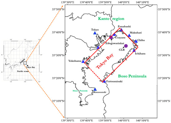 As shown in Figure 1, Tokyo Bay is located in the central part of the main island (Honshu) of Japan. The bay, bordered by the vast Kanto region to the north, the Boso peninsula to the east and the Miura peninsula to the west, is a semi-enclosed estuarine embayment that faces the Pacific Ocean through a narrow waterway (Kannonzaki to Futtsumisaki waterway). The length of Tokyo Bay’s coastline is almost 890 km, and its area covers approximately 922 km2 [26]. The bay stretches approximately 60 km along its major length and 20 km along its minor length, and the average water depth is 15 m, with the western side being deeper than the eastern side [1,2,26,27].