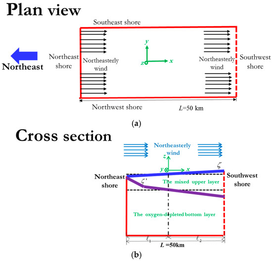 - Although the actual coastline of Tokyo Bay is irregular, the chosen domain was considered to be a rectangular flat domain 50 km in length, 20 km in width and with an average water depth of 15 m, as indicated by three solid red lines and a dashed red line showing the imaginary southwest shore in Figure 1. The remaining 10 km is the outer bay, which does not have not much exchange with the inner bay, as shown by many studies [15,22,26,28]. Figure 2a schematically shows the dimensions of the chosen research domain, where is the length, and in the right-handed Cartesian coordinate system, the axis follows the northeasterly wind, the axis is perpendicular to the length direction, and the axis is positive in the upward direction relative to the quiescent surface water level;