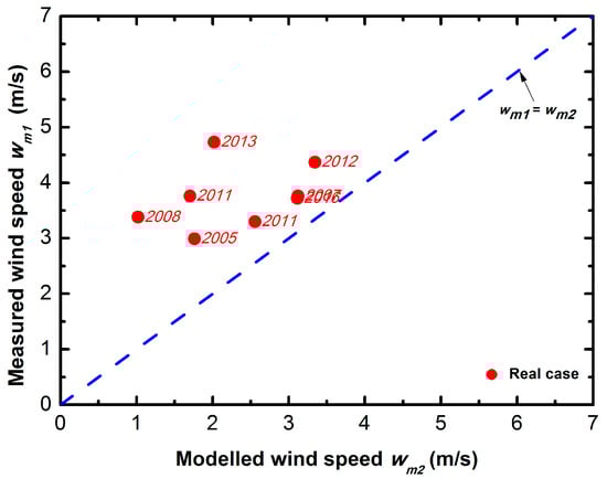 Comparison of measured wind speed and modelled wind speed for real cases of blue tides observed on the northeast shore of Tokyo Bay during 2003–2016, except 2014.