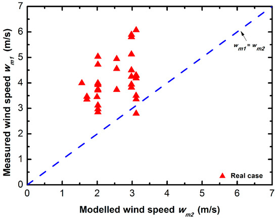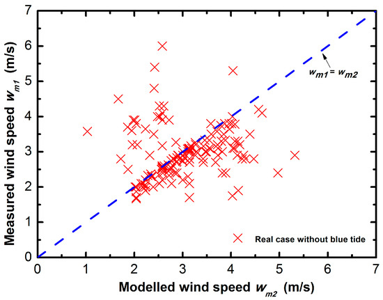 Comparison of measured wind speed and modelled wind speed for real cases in which continual blowing of the northeasterly wind did not lead to the occurrence of blue tides on the northeast shore of Tokyo Bay during 2003–2016.