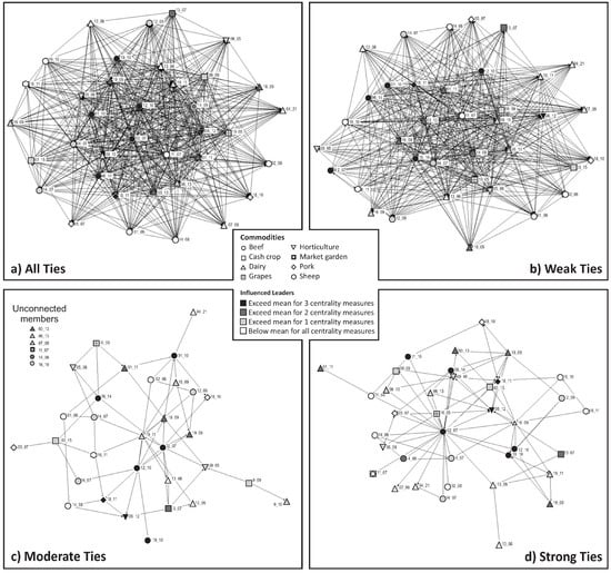 Figure 1a summarizes the pattern of all ties of different strengths between agricultural representatives within the network. A visual inspection of the graph suggests that there are many ties among network members. The network was analyzed using the SNA measure of density (Table 1), which provided a measure of how well-connected the members were, as well as an indication of how cohesive the network was during data collection [28,60,64]. A density score of 0.60 was calculated for valued and directional data, indicating that 60% of the possible ties in the network were present. This score suggests that, overall, the network was moderately cohesive, which allowed for the sharing of beliefs and values [59], but possibly not so closed that new ideas could not be introduced and discussed within the network as has been speculated in the literature [67].