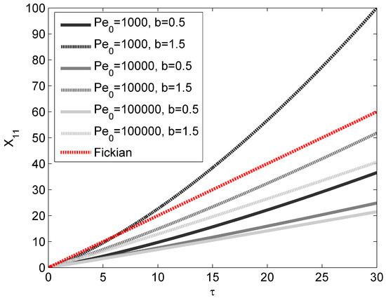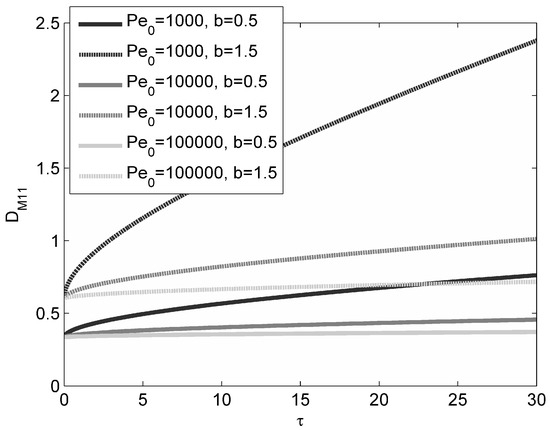 Equations (69) and (72) are graphically represented in Figure 1 and Figure 2, respectively, for = 3 and a travel distance equal to 30l0. As one can see, the effect produced by high Péclet (Pe0) numbers is opposite to the effect produced by high scaling exponents (b). Specifically, the higher the Péclet number, the closer the transport process to asymptotic Fickian conditions, represented by a constant longitudinal macro-dispersion coefficient (although, for τ → 0, the dispersion coefficient is higher for higher Péclet numbers due to the larger number of heterogeneity scales initially sampled). Conversely, the higher the scaling exponent, the faster the macro-dispersion coefficient increases. Notice that, in Figure 2, the red dotted line represents the Fickian, linear behavior corresponding to a single-scale log-conductivity field (exponential or Gaussian log-K covariance) characterized by the truncated-hierarchy variance and by an integral scale equal to the initial plume size. Thus, unlike the case of fast-decaying correlation functions, the coexistence of evolving-scale advective heterogeneity and intensive diffusive mixing acts as an antagonist mechanism in the process of solute dilution and Fickian regime achievement. Such a behavior, which is in definite contrast with what was previously found for stationary porous media, was detected here for the first time.
