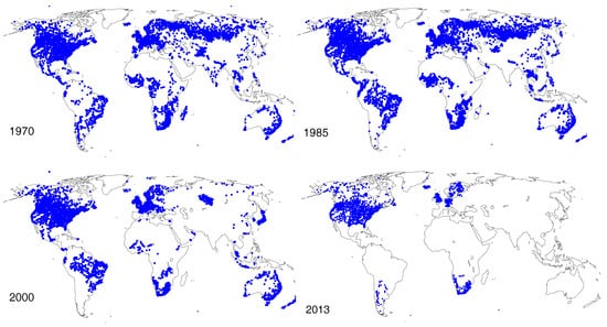Available stations (updated in March 2017) with discharge data according to the Global Runoff Data Centre (GRDC) database (http://www.bafg.de/GRDC) for different years from 1970–2013.