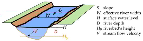 In order to estimate the riverbed’s height and, consequently, river depth , we rely on two models developed for discharge estimation. It should be noted that is the average riverbed’s height that does not correspond to the height of deepest location in the channel section (see Figure 2). Generally, a functional relationship between depth and discharge can be developed from the Manning equation, which is applicable to natural rivers [44]. For a wide rectangular channel with , discharge can be obtained from the Manning equation as: