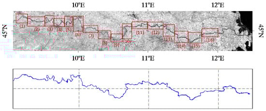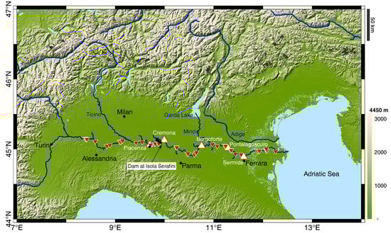 The Po River, located in the Po valley in Italy, flows 652 km eastward through many important Italian cities, including Turin (Torino), Piacenza and Ferrara (Figure 3). Since the river is subject to heavy flooding, over half its length is controlled with dikes. A major dam is located at the village of Isola Serafini 40 km downstream of Piacenza [37]. For this study, we defined 16 reaches along the river from Bressana () up to Berra () almost every 20 km (Table 1). In order to obtain two distinct reaches up and downstream of the dam at Isola Serafini, Reach 5 ends at the dam with a length of 11.8 km, and Reach 6 starts from the dam location with a length of 28.2 km. The river reaches are delineated in Figure 3. We selected this river for this study because of the following reasons.