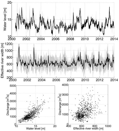 Figure 4 shows the time series of effective river width together with the estimated uncertainty for Reach 12. Since the river is very narrow with respect to the MODIS pixel size of 250 m, the magnitude of uncertainty is relatively large. In Figure 4 (bottom panel), we compare the obtained effective river width against in situ discharge for the same reach. An agreement between the behavior of the two time series is expected. The majority of the river section passes through urban areas with river channel contraction at the shoreline leading to the non-natural behavior of the river. Figure 4 (bottom panel) comprises the obtained water level and the effective river width with the in situ discharge data at Borgoforte. The scatter plots clearly demonstrate the challenge of using satellite imagery for discharge estimation, whereas water level from altimetry agrees relatively well.