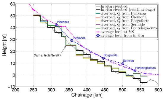 Unlike H, W and S that are available for each reach, discharge data are not individually available for each reach. We use discharge data at five in situ gauges along the river. However, the question remains which in situ discharge data lead to a better result for the estimation of . The intuitive answer to this question is, of course, the discharge data at the gauge nearest to the selected reach. In order to assess this issue, we first estimated and a for all the reaches with the help of discharge data at all the gauges. Figure 6 shows the estimated after the implementation of the GHM for the selected reaches along the Po River. For each reach, we obtain five estimates of and , for which we use different discharge data. It is interesting to observe that the estimated for each reach is nearly independent of the choice of discharge data. In principle, we obtain similar values with a discrepancy of ∼2% with respect to average riverbed’s height with the discharge data of different gauges. Comparing the estimated with those surveyed along the river (black steps) shows a general good agreement in the range of ∼10% relative RMSE.