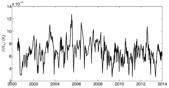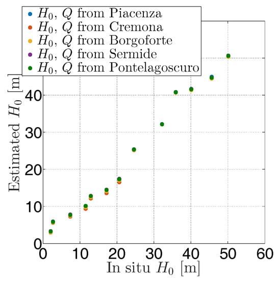 The direct formulation (21) is also beneficial for investigating why the estimation of is insensitive to the choice of discharge station. Figure 13 shows that for Reach 1 varies between 3 × 10 and 12 × 10 with an average value of . On the other hand, according to Table 3, average discharge at different stations is 933, 1075, 1313, 1378 and 1477 m/s, respectively. This would mean that for the estimation of of Reach 1, a mischoice of Pontelagoscuro station with an average discharge of 1477 m/s instead of Piacenza with an average discharge of 933 m/s would lead to only 0.36 m error in ().