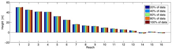 Estimated river bed height by considering 20%, 40%, 60%, 80% and 100% of data in the time series of water level, width and discharge along the Po River for 16 defined reaches.