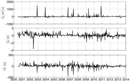 As a result of GHM, is also estimated, which comprises the corrections to the original observations. Figure 9 shows estimated residuals for discharge , water level and effective river width data of Reach 1 in the case of using the model by [9]. In fact, the two global unknowns of a and are estimated by adjusting the observations within the selected model and minimizing the error.