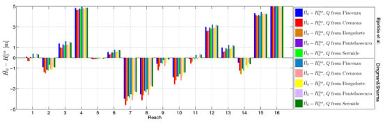 Bar plot of difference between estimated riverbed’s height and those from in situ using discharge data of different gauging stations along the Po River.