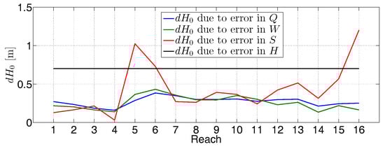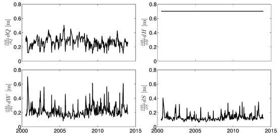 The sensitivities , and depend on other parameters that are varying in time. In order to assess the error in due to the error of water level, width and discharge, here we assume a constant error of 0.7 m for water level time series from altimetry, which would lead to a constant error of 0.05 m/km for the slope of two consecutive reaches with a distance of 20 km (Equation (19)). For the effective river width, we use our time variable uncertainty estimates based on the method by [43]. For discharge, a multiplicative error of 10% is assumed. Figure 11 shows partial errors in due to the errors of other parameters in Reach 1. The contribution is about 0.2 m of the discharge’s precision on the precision of estimated . The average error in due to the errors of our width estimates is about 0.3 m. Since is time variable, a constant error in slope leads to a time variable error contribution with the average value of approximately 0.2 m for reach 1. This result shows that among all the parameters in Models (5) and (6), errors in height will contribute the most in the estimation of under the assumption that .
